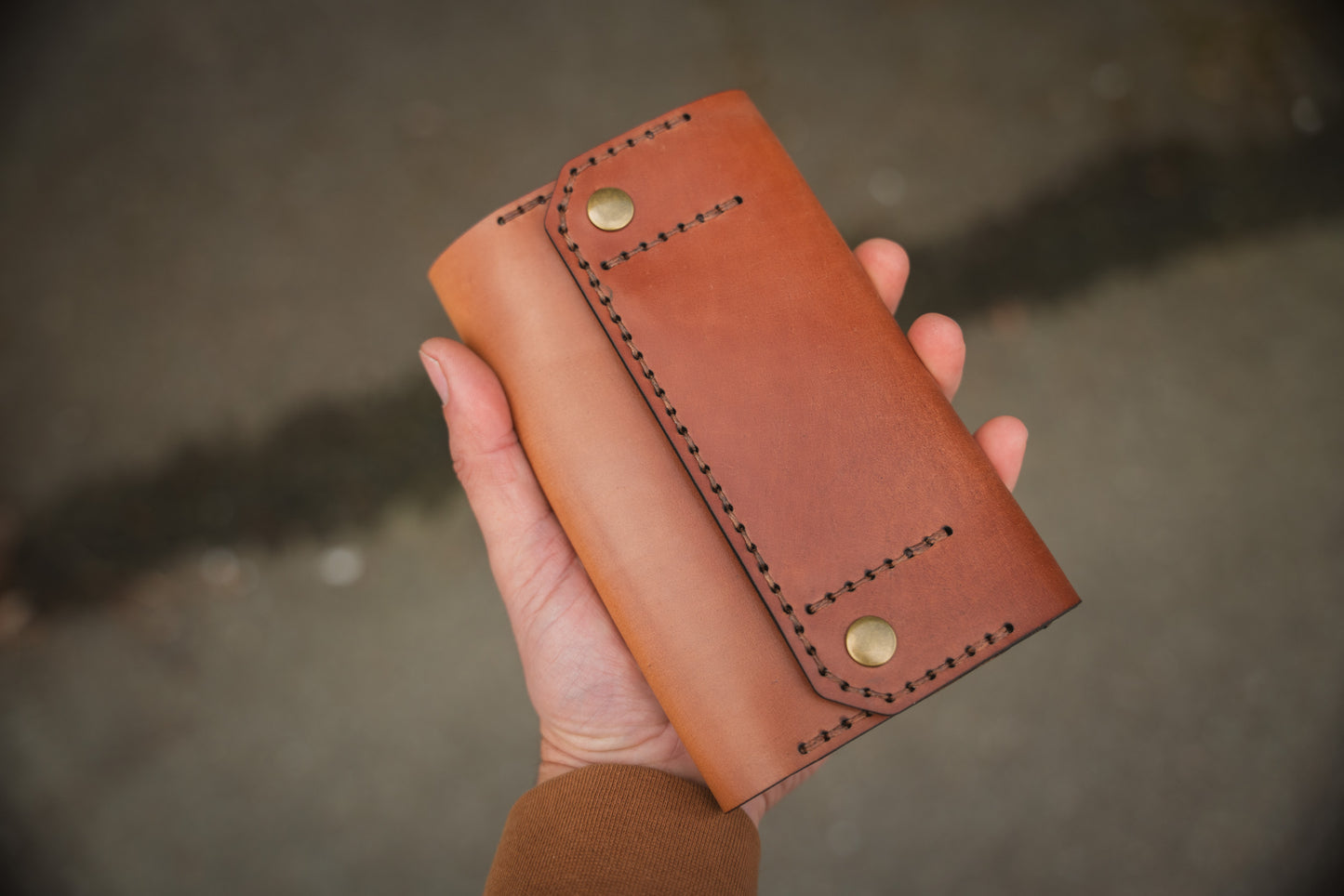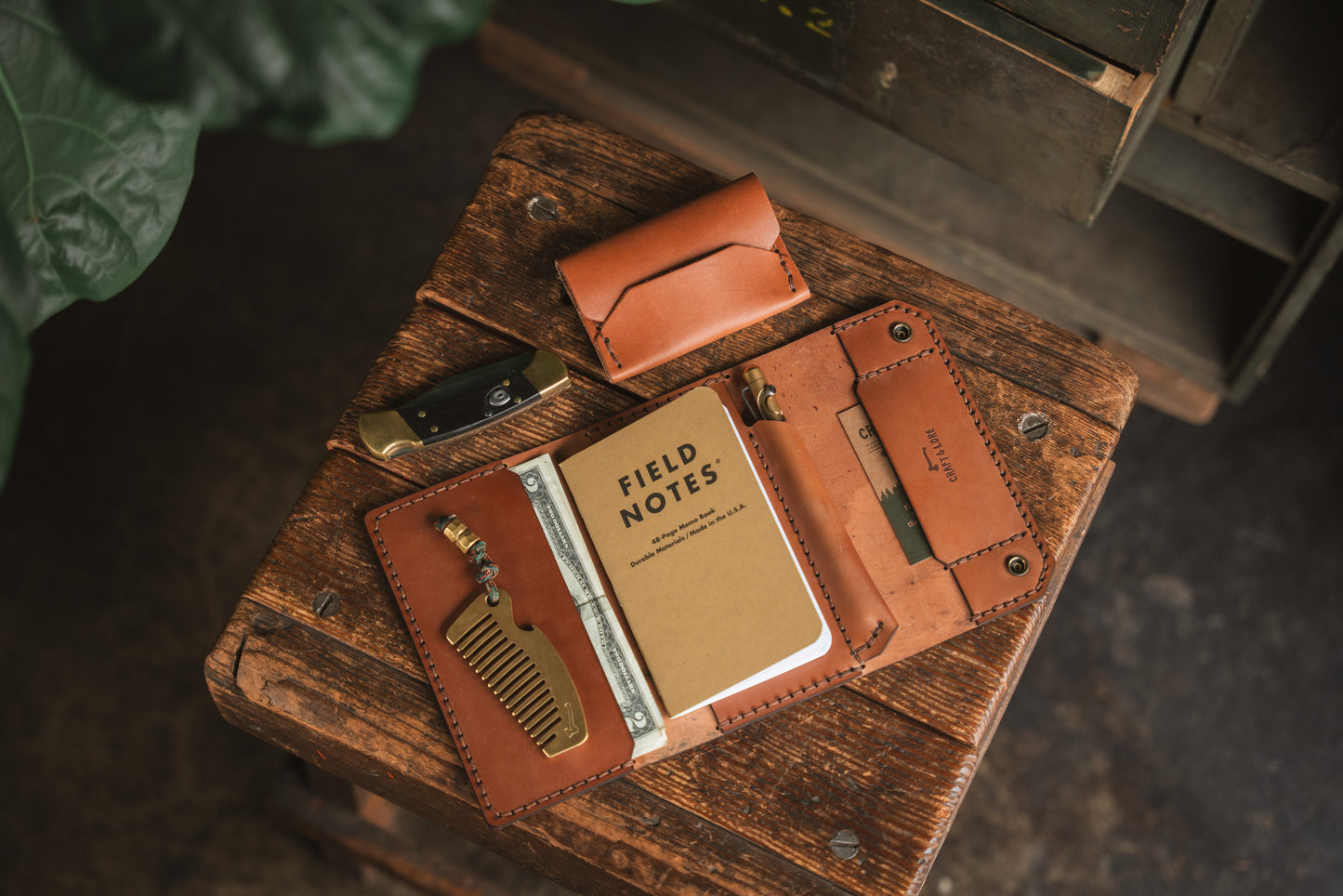 Balance your life using a sturdy built leather notebook wallet with pen holder. Fits a checkbook, cash unfolded, and a few cards. Hand stitched to guarantee a long life of wear and hard use. This edition is built from world-renowned rare and wonderful Horween Shell Cordovan leather.