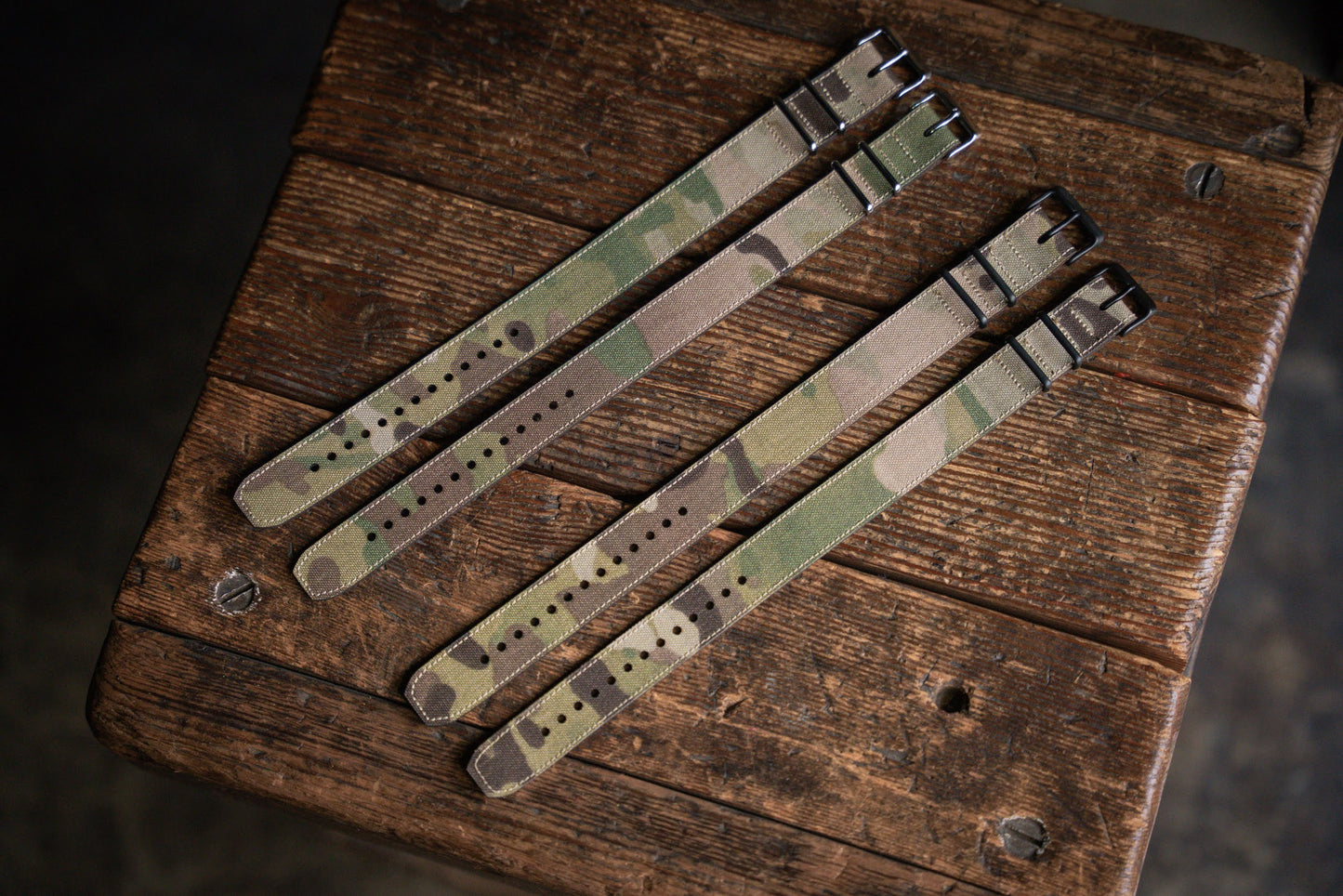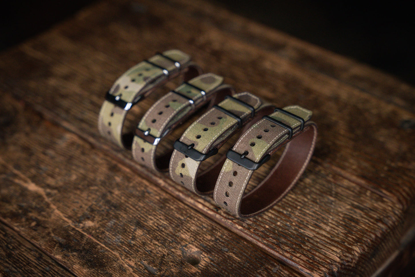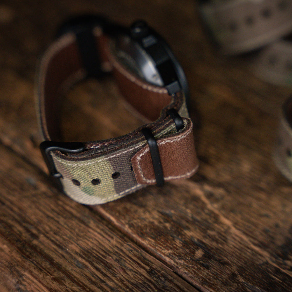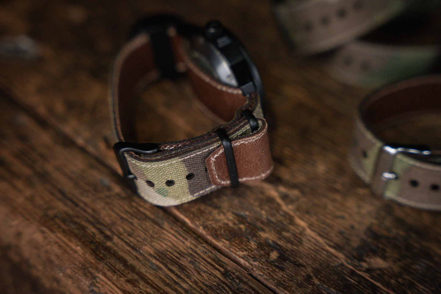 This military style passthrough watch strap is built in our workshop from 1000D Multicam™ Cordura and backed with sturdy high grade Italian Buttero leather from the respected Conceria Walpier tannery.