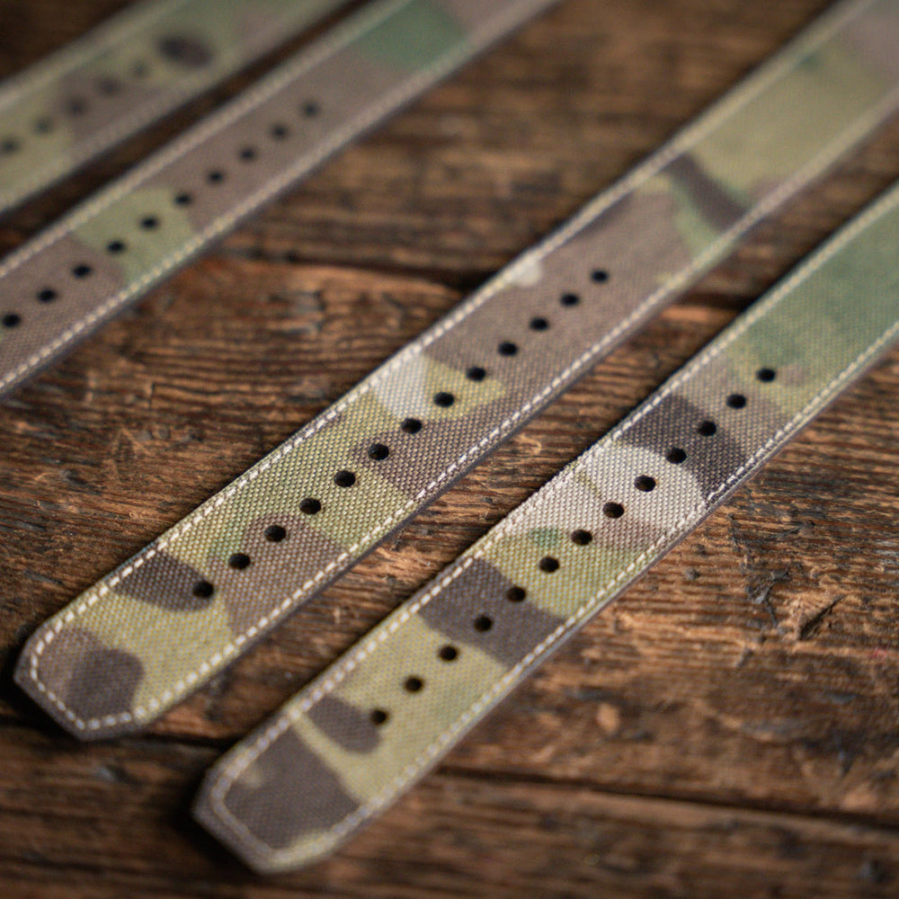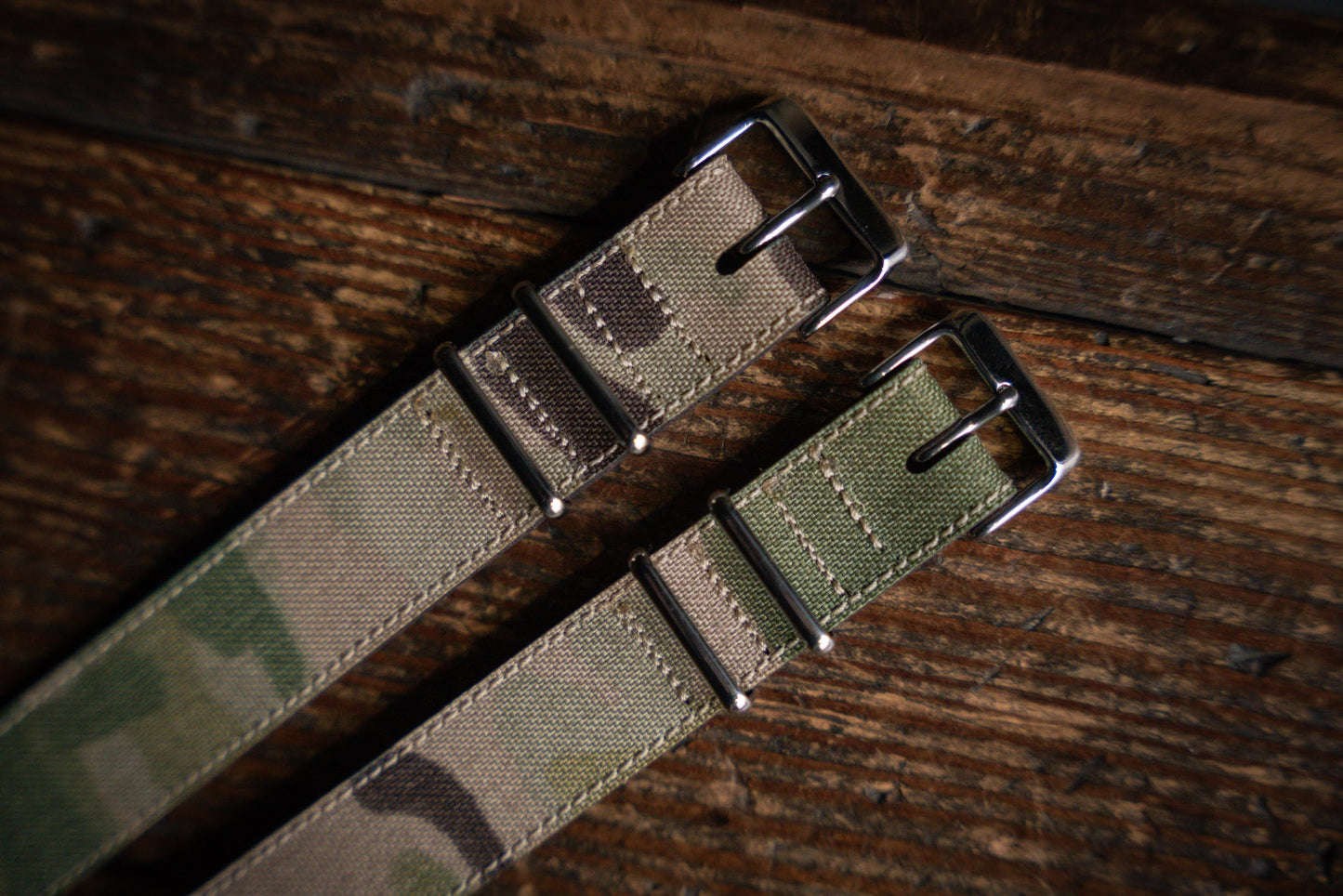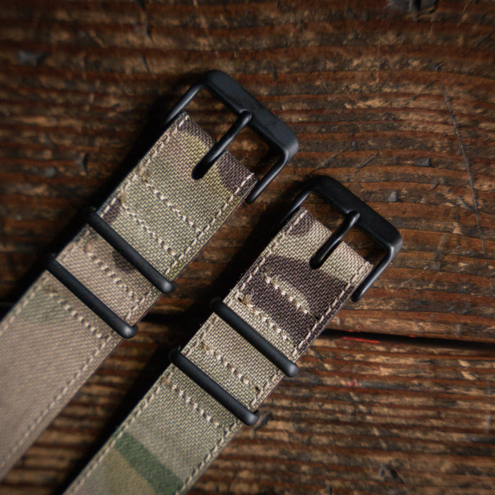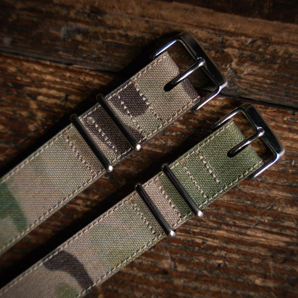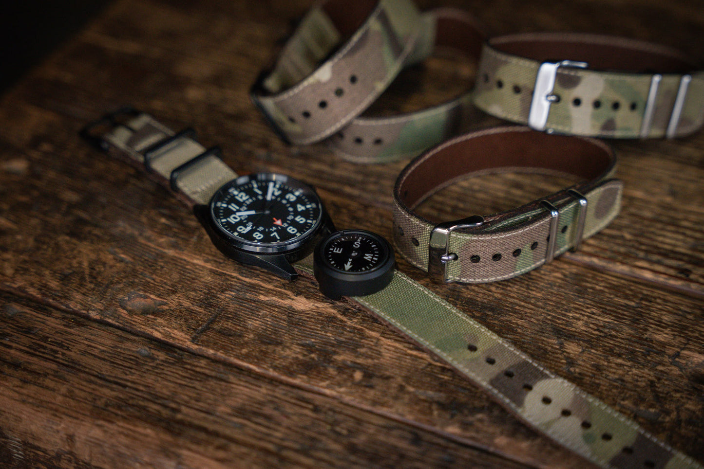 This military style passthrough watch strap is built in our workshop from 1000D Multicam™ Cordura and backed with sturdy high grade Italian Buttero leather from the respected Conceria Walpier tannery.