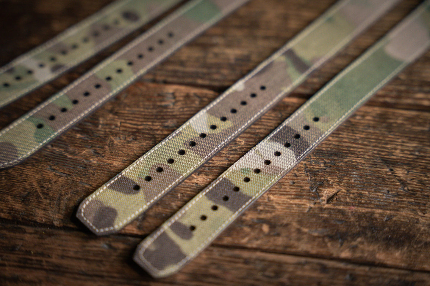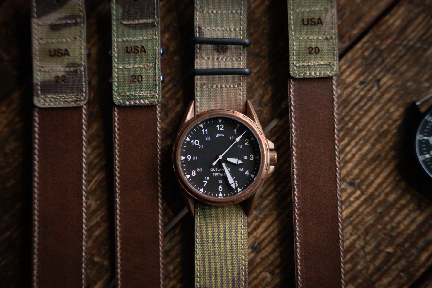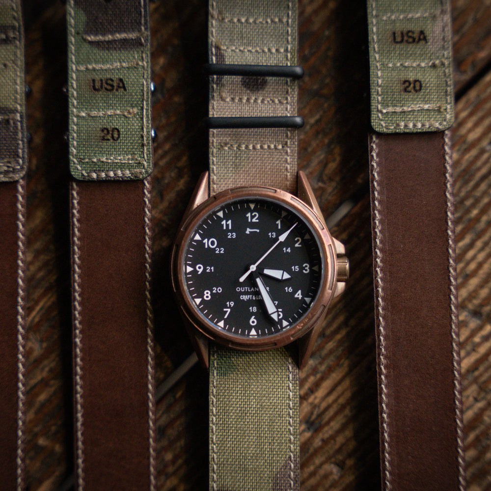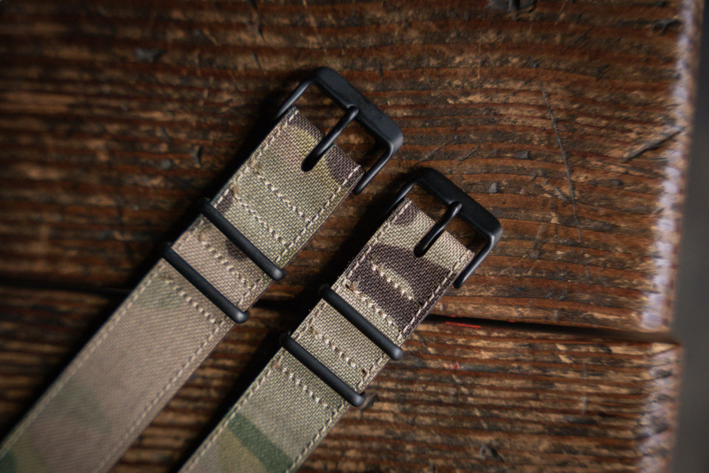 This military style passthrough watch strap is built in our workshop from 1000D Multicam™ Cordura and backed with sturdy high grade Italian Buttero leather from the respected Conceria Walpier tannery.