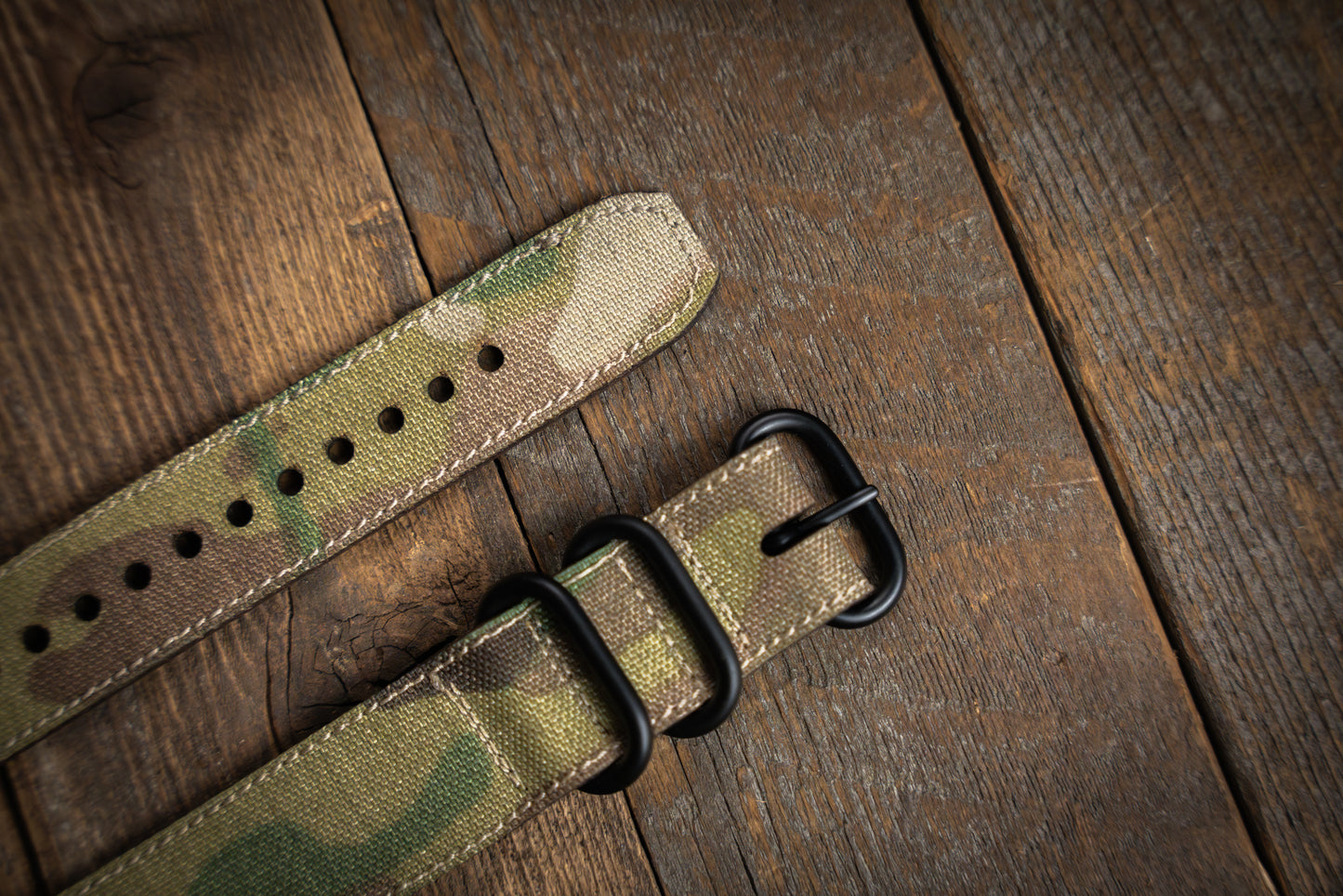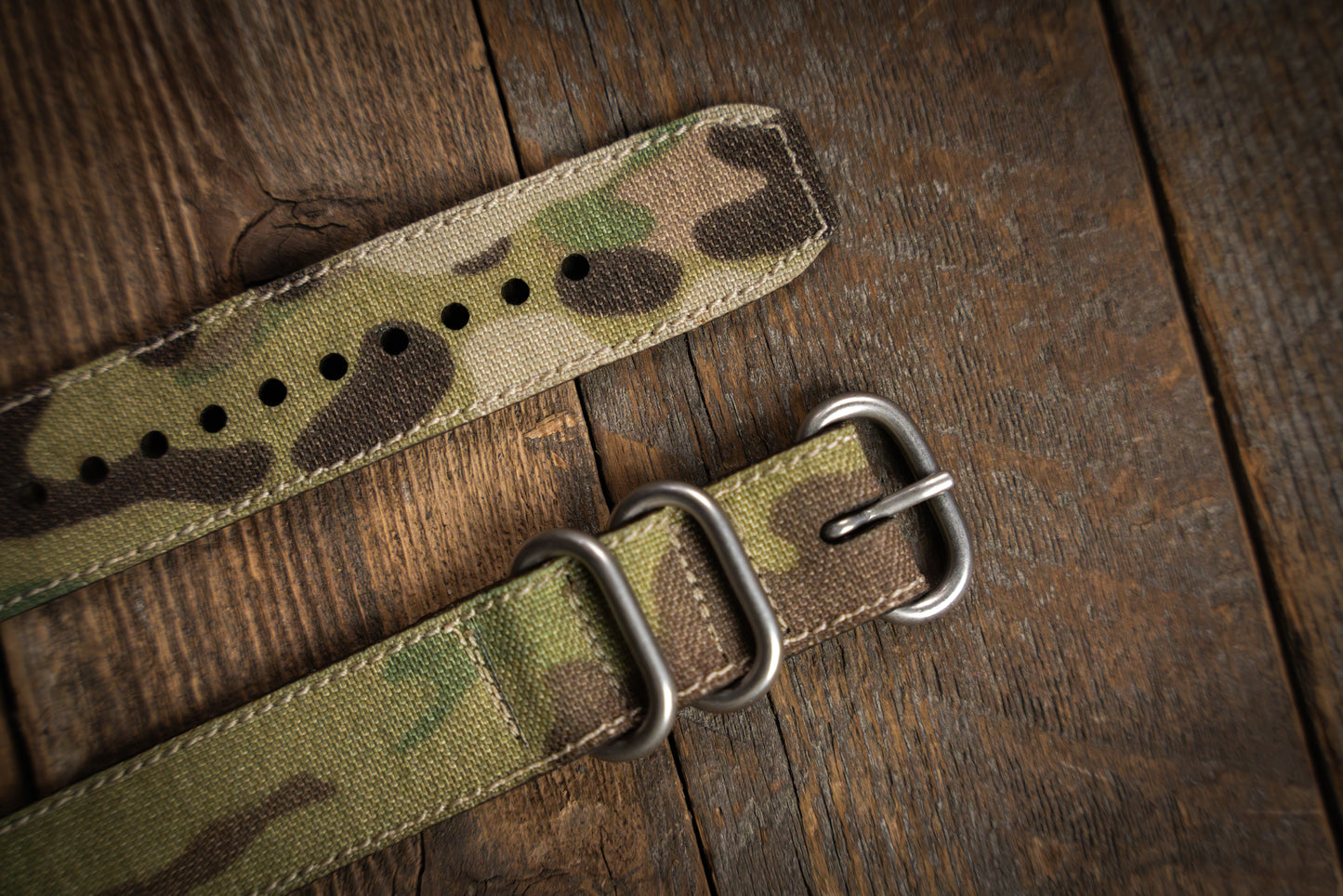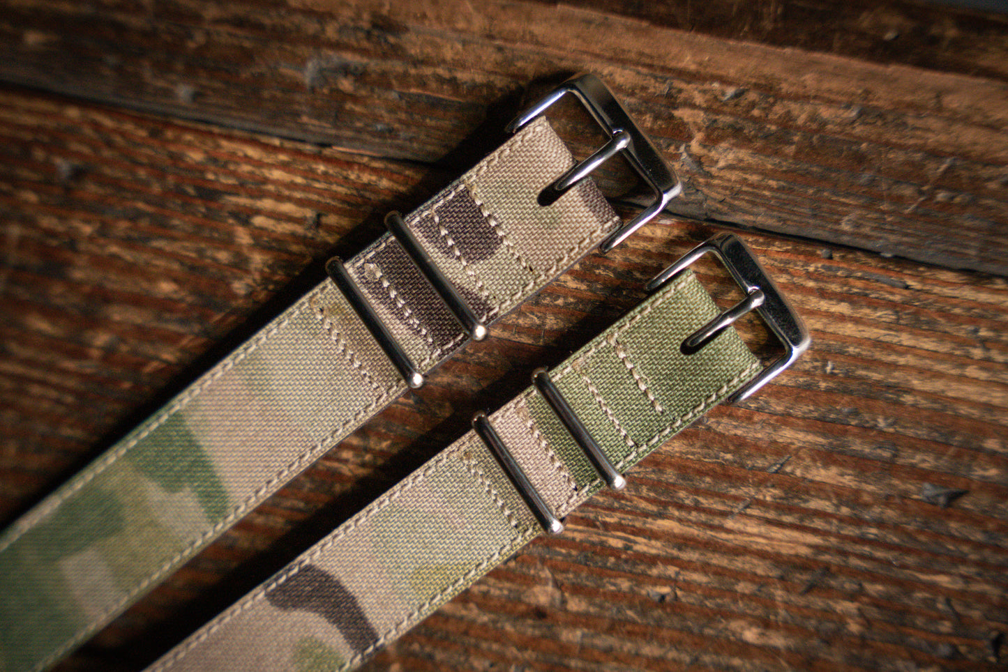 This military style passthrough watch strap is built in our workshop from 500D Multicam™ Cordura and backed with sturdy high grade Italian Buttero leather from the respected Conceria Walpier tannery. The two materials are high-strength bonded together and sewn for a durable strap backed with the comfort of leather.