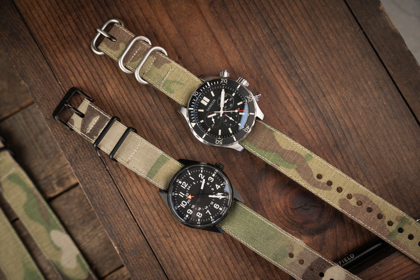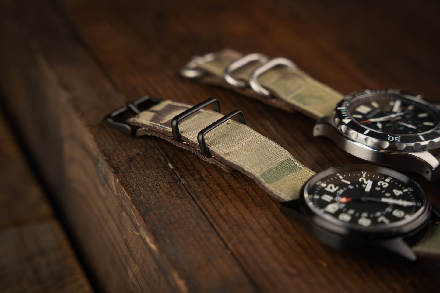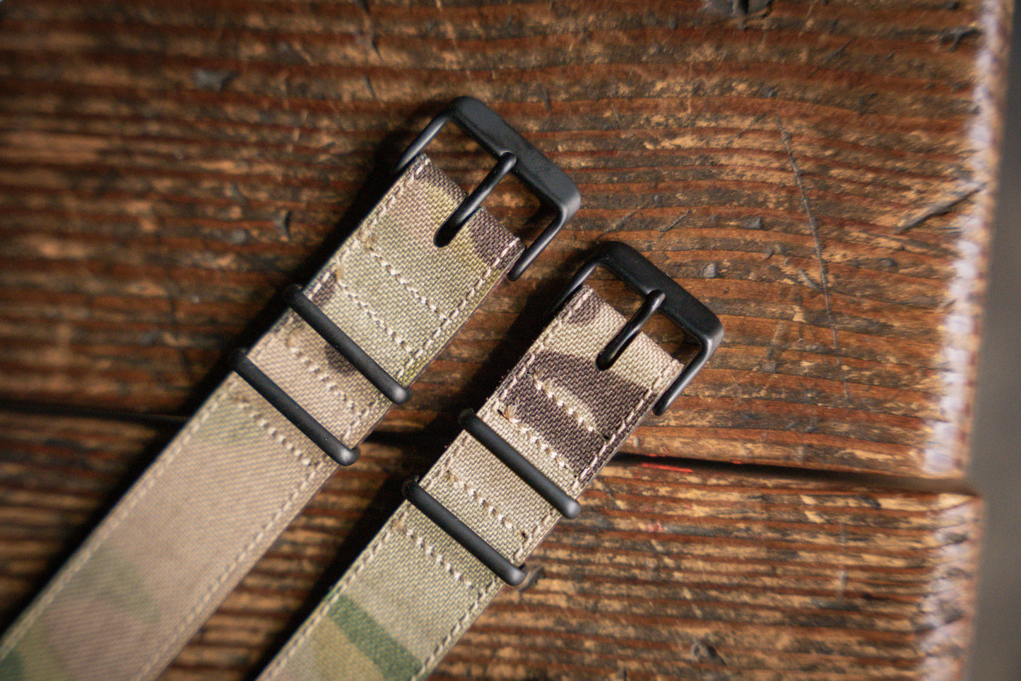 This military style passthrough watch strap is built in our workshop from 500D Multicam™ Cordura and backed with sturdy high grade Italian Buttero leather from the respected Conceria Walpier tannery. The two materials are high-strength bonded together and sewn for a durable strap backed with the comfort of leather.