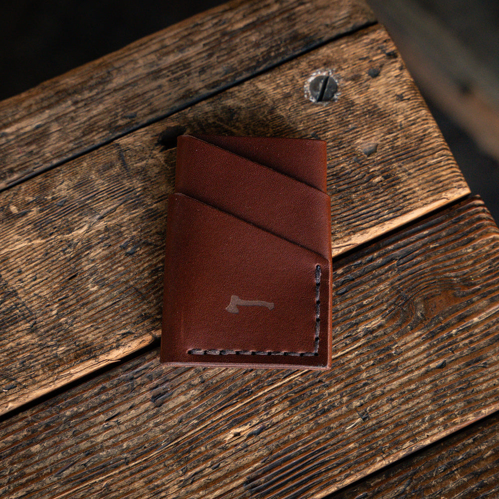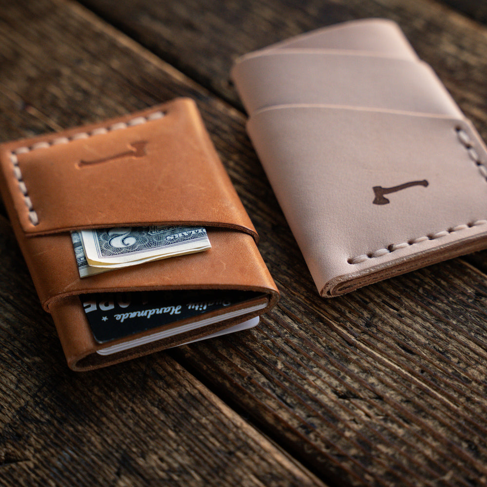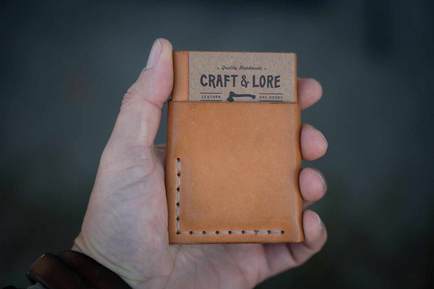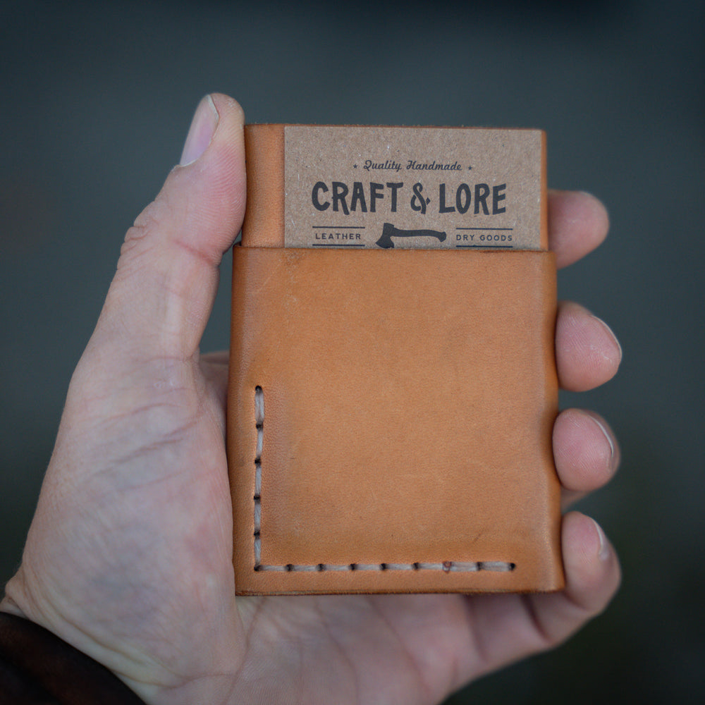 This original Craft and Lore design uses a single piece of leather wrapped around itself, with only the needed stitching, to complete a beautiful minimalist design. Pack your main cards in an outside pocket, your cash in the short pocket, and the lesser used cards inside the center port. The Port Wallet fits comfortably in the front or rear pant pockets as well as in the palm of your hand.