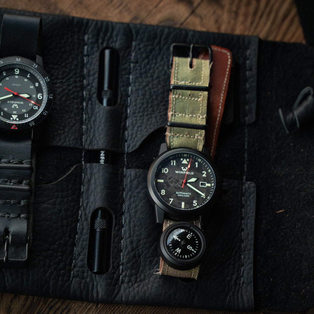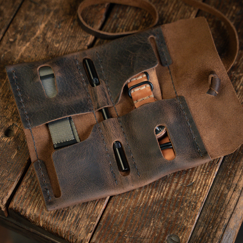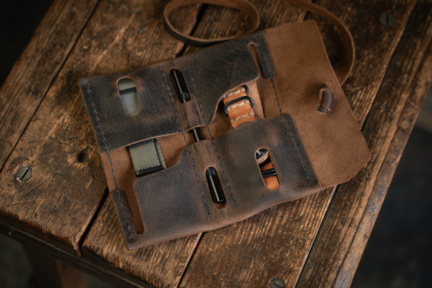 This compact leather watch pack can hold 2 watches and a spring bar tool in a classic roll with tie wrap. Perfect for professionals who wish to travel their dressy time piece alongside their casual watch. Expect a beautiful patina to develop over time, as the leather gets better with age. Check out our Watch Straps.